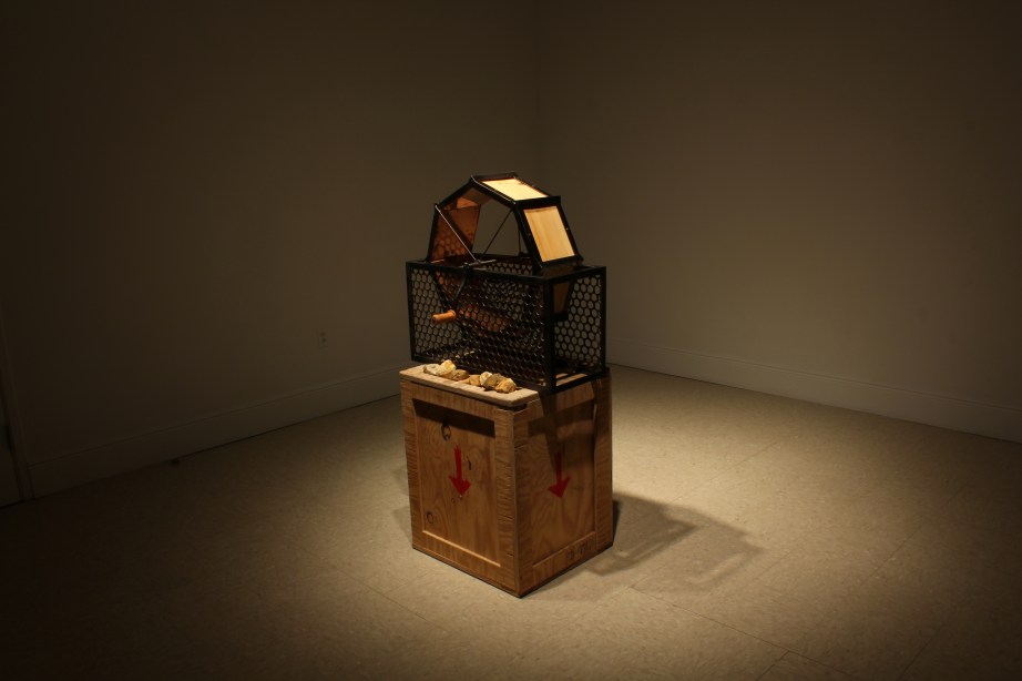 Conversation Wheel (For Conversation With Stones from Tishomingo) Steel, copper, white pine, plywood, packing material, stones 2011-13 Next → Return to gallery ← Previous